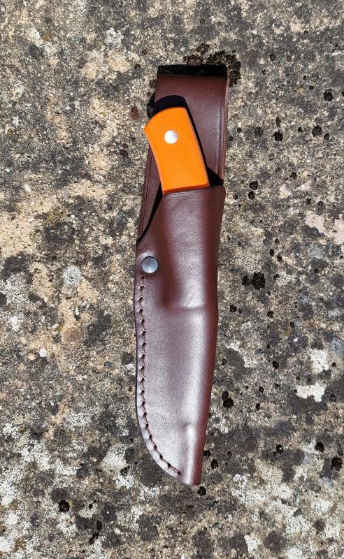 Handtaget - som är gjort för följa handens form - och inte tvärtom - oavsett hur du håller kniven - är i slitstarkt G10 med bra grepp och orange färg så du lätt hittar kniven när du lagt ifrån dig den.